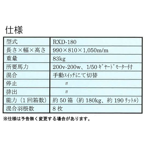・逆転排出でこの価格! ◆仕様 制御方法:半自動(セレクトスイツチで切り替え) サイズ :990×810×1,050mm 重量 :83kg 所要馬力:200V-200W、1/501ギヤードモーター付 混合 :手動スイッチにて切替 停止 :手動スイッチにて切替 排出 :手動スイッチにて切替 能力(1回箱数):約50箱(約180kg、約190L) 混合羽根数:8枚吉徳農機のリバース混合機!